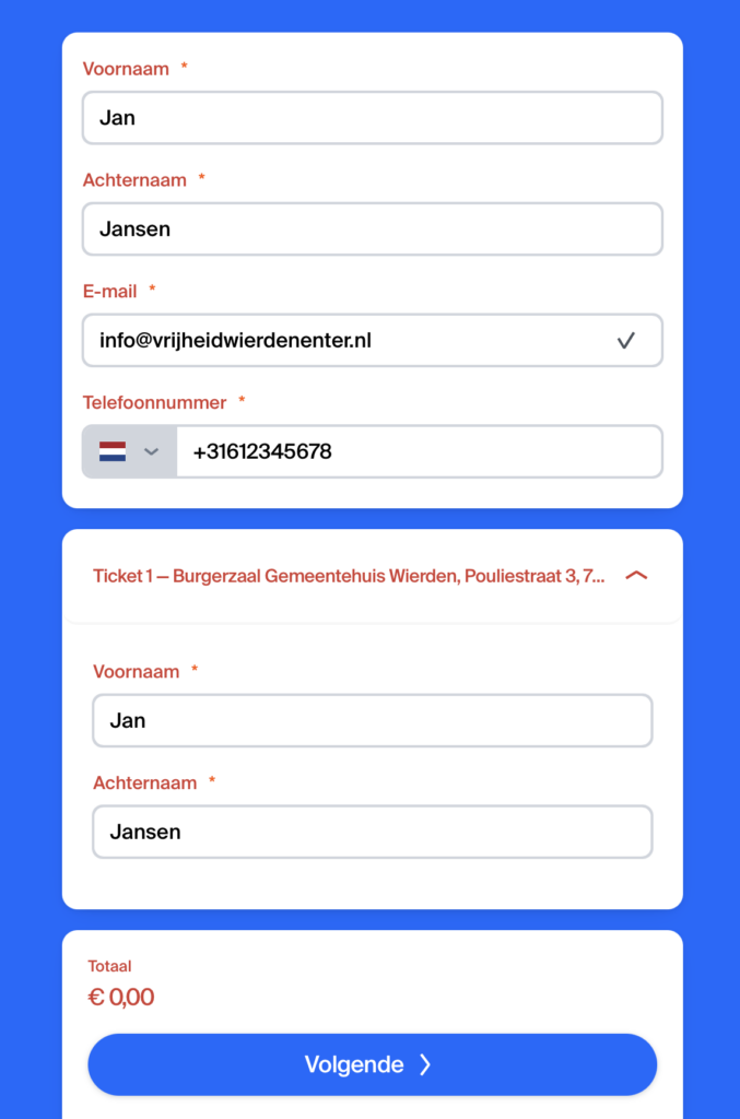 - Vul bovenaan uw voornaam, achternaam, e-mail adres en telefoonnummer in. Op het mail adres dat hier ingevuld wordt zullen de kaartjes gestuurd worden. LET OP! Het telefoonnummer moet op de internationale manier ingevuld worden. Dus eerst +31 voor Nederland en dan het telefoonnummer zonder de voorloop ‘0’.